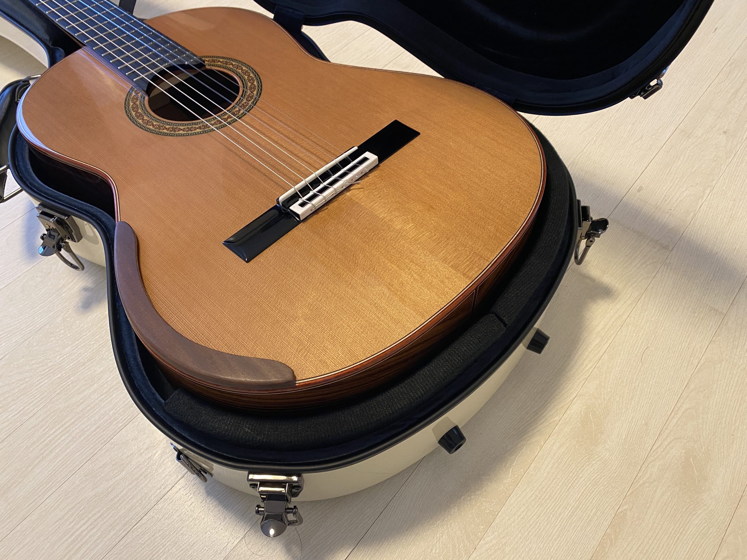 I got my cedar top A-Echoes guitar last week after about a month of waiting. The factory setup of the action needs to be adjusted down quite a bit on both the nut and saddle to suit my personal practice. The sound of the double top design is quite different from the traditional classical guitar. Like some guitarists have put it – you will either learn to love it or hate it. It is all personal taste and preference. However, the sound of each strings are quite evenly distributed and loud, responsive to touch.