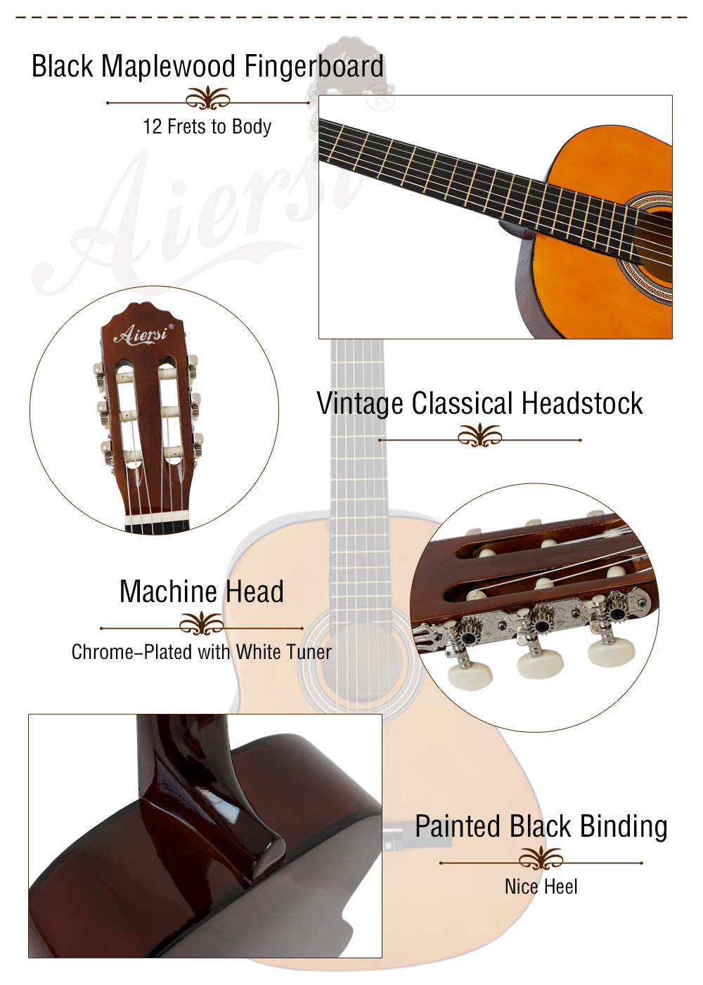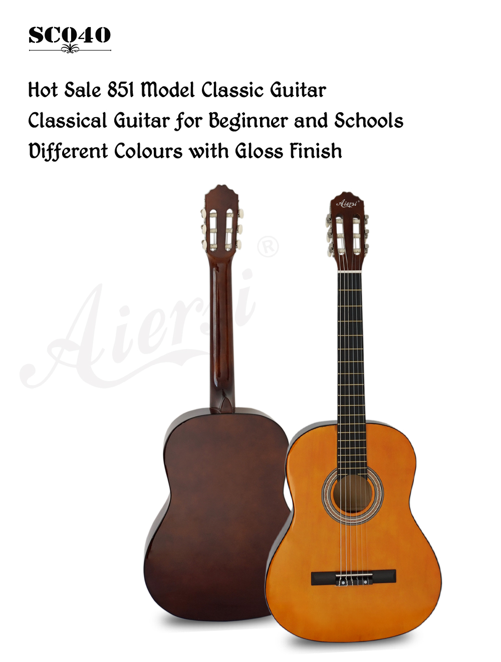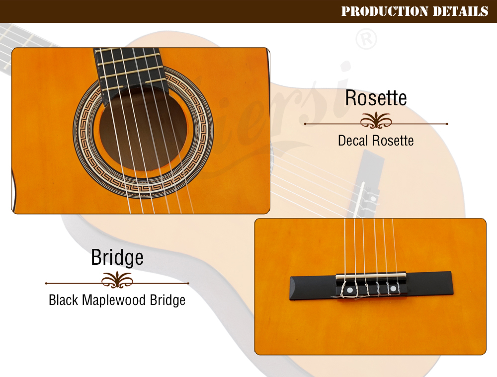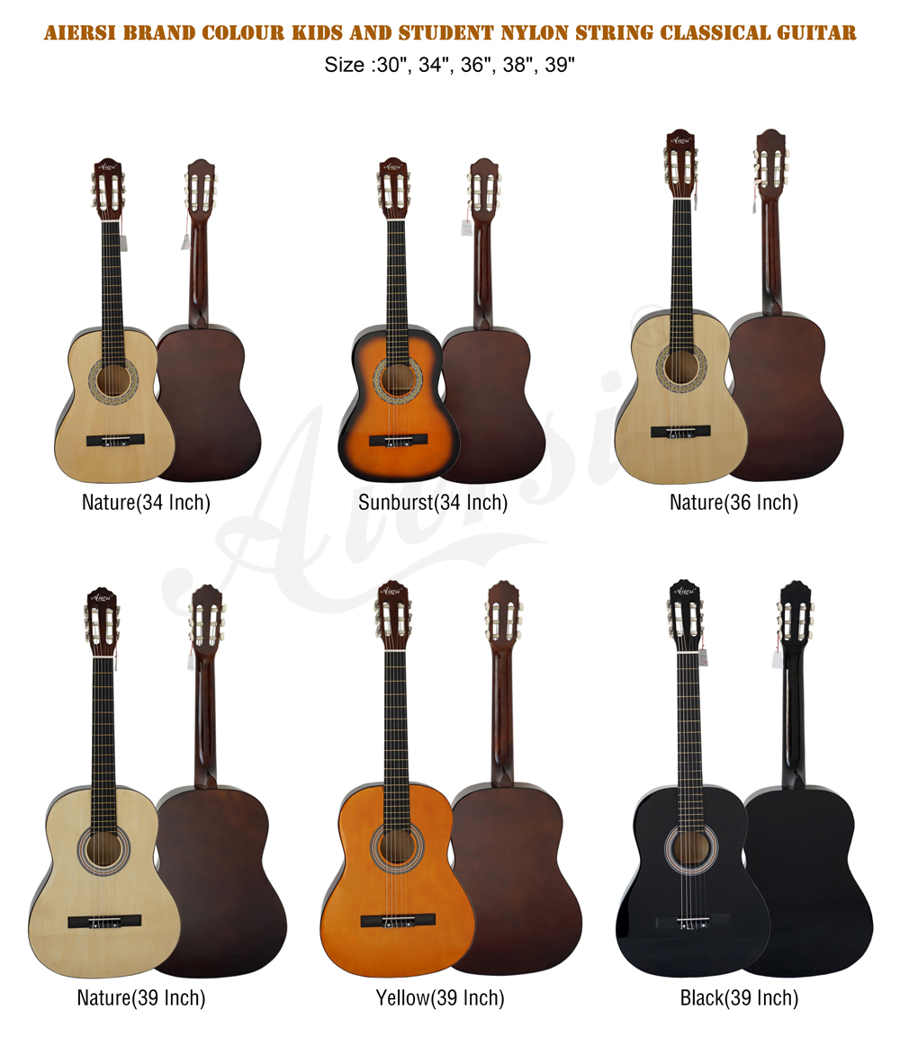This is basic practice grade nylon string classical Guitar for Starter or Beginner,This is cheapest price handmade Classical Guitar Model SC040A Our Aiersi Laminated Classical Guitar will satisfy the needs of beginner is looking for the sound and play-ability of a real guitar. it has a loud and bright ringing tone that clearly projects to the listener.This Classical guitar set also features everything you need to get started .If you’re looking for a good deal on an entry-level Classical guitar, it’s an ideal choice. It makes a great gift and is a great value for the money. Wholesale Cheap Price Practice Student Colour Lindenwood Classical Guitar