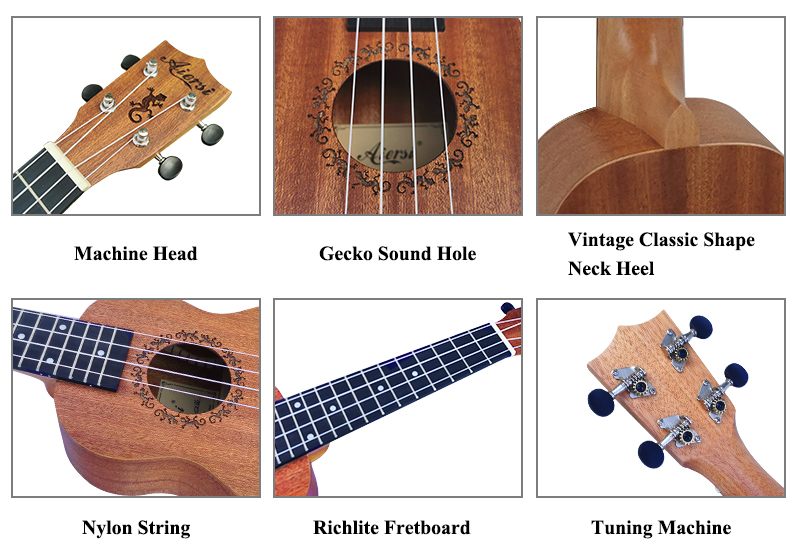 China Aiersi Brand Quality Starter Plywood Body Soprano Hawaii Ukulele Specifications: Top,Back&Side: All Laminated Mahogany Neck: Solid Mahogany String: Aquila String Machine Head: Plastic/Open Nut&Saddle: Plastic Fingerboard&Bridge: Indian Rosewood White Copper Frets Laser Gecko Design Sound Hole Finish: Matt Open Wood Pore Finish China Aiersi Brand Quality Starter Plywood Body Soprano Hawaii UkuleleVIDEO