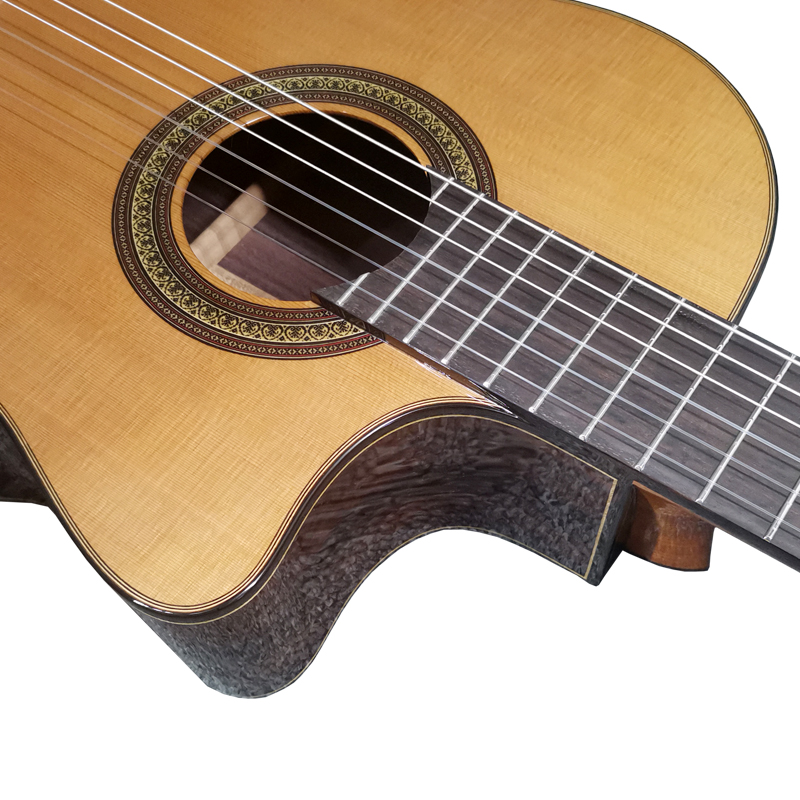 We finally have at our disposal a CUTAWAY CLASSICAL GUITAR that sounds like a traditional guitar! It is a very balanced guitar: it plays well in every position and in every register and the timbre is clear so as to make every note easily recognisable. The woods used are of premium quality and the finishes are excellent. I recommend this guitar to all those who are looking for a professional cutaway, but also to “traditional” guitarists who want to expand their set of instruments at an honest cost because, as always, the value for money of Aiersi guitars is truly unbeatable!