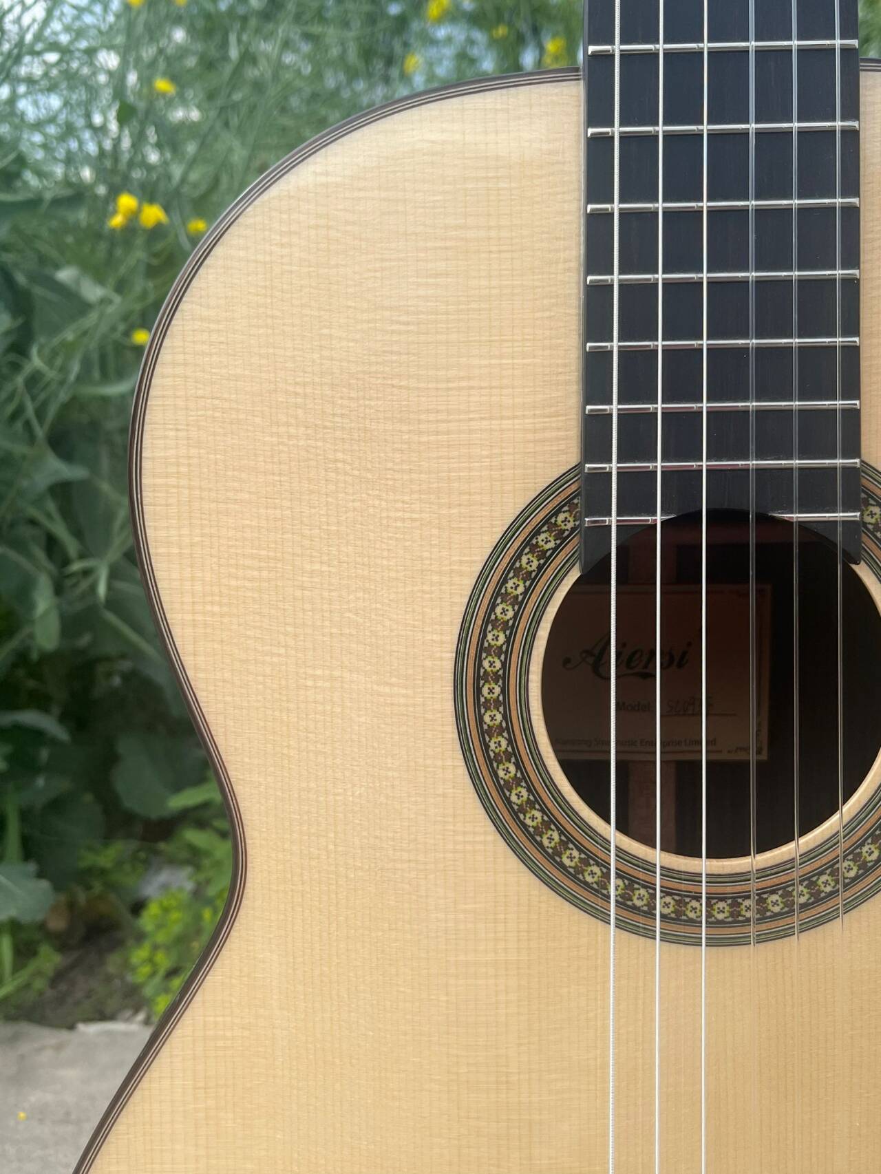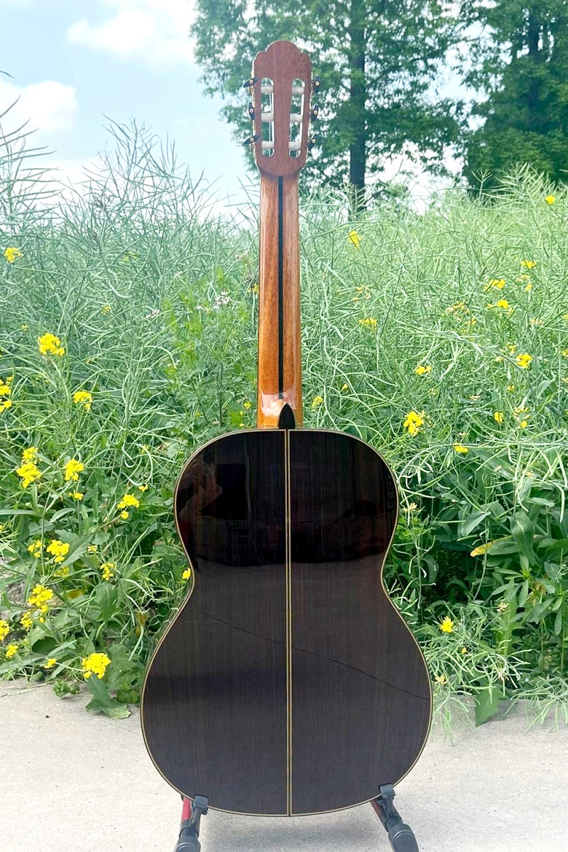 The 1937 Hauser Replica Classical Guitar Is characterized by substantial volume, beautiful tone, clarity and sustain. The back and sides are made of solid, high-grade Indian Rosewood. The top is German Spruce. The bracing and design are a duplicate of the original 1937 Hauser Guitar that was made for Andres Segovia. Segovia refered to his Hauser guitar as “the greatest guitar of our epoch.” This model is made in the shop of world-acclaimed luthier, Yulong Guo, and the construction is supervised by him. The scale length is 650mm, with a nut width of 52mm. Position marker dots have been placed on the edge of the fretboard at the 5th, 7th, and 9th positions.